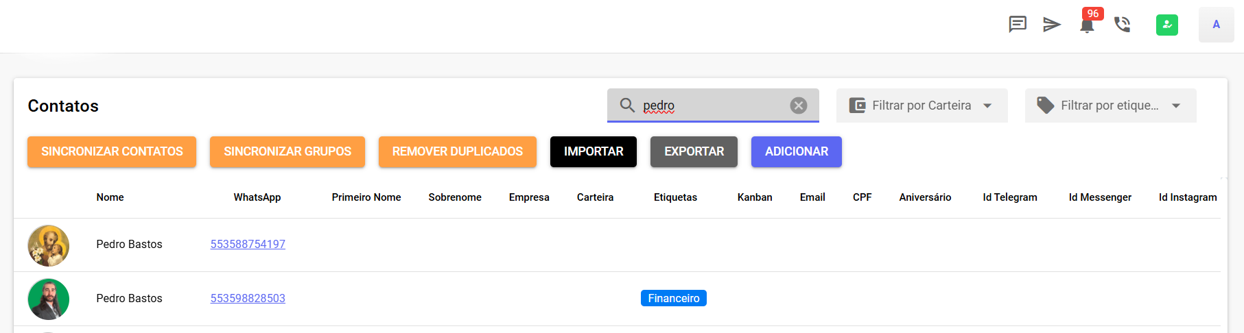É possível realizar um filtro nos contatos por carteira ou etqiueta.