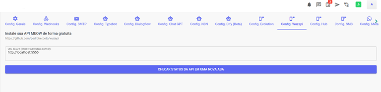 Antes de conectar a Wuzapi, você deve informar as credenciais de acesso nas configurações